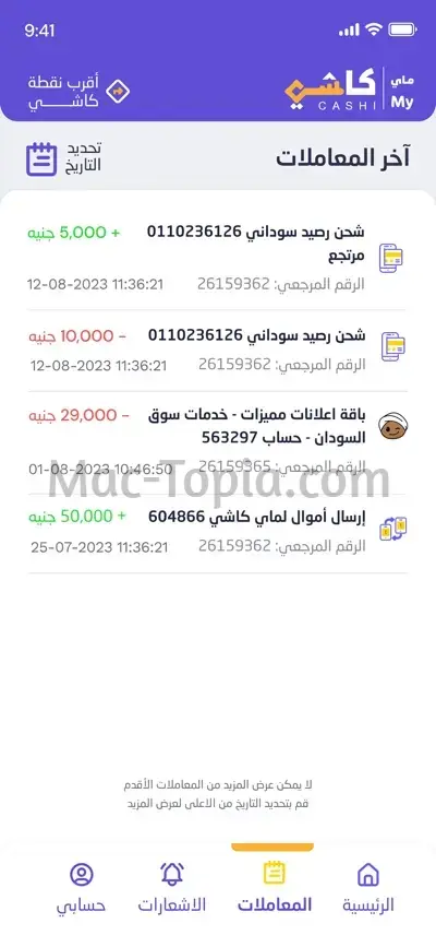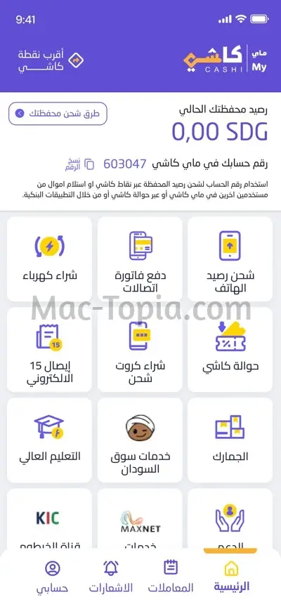 يقدم تطبيق MyCashi خدمة التحويل اللحظي للاموال عبر المحافظ الالكترونية اون لاين داخل دولة السودان, بالإضافة الى ذلك تستطيع من خلاله سداد جميع الفواتير للخدمات الحكومية او للمؤسسات الخاصة, البرامج متاح الان على موقع ماك توبيا مجانا للعمل على اجهزه الموبايلات الذكية التي تعمل بأنظمة تشغيل مختلفة, تستطيع تنزيلة بروابط مباشرة سريعة من خلال المتاجر الرسمية.
